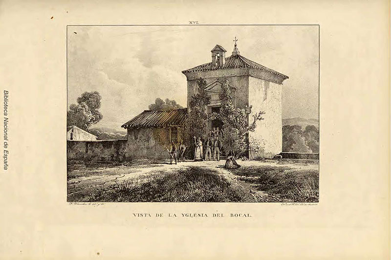 Lámina XVI. Vista de la iglesia de El Bocal. Vista de la Capilla del Bocal en el acto de salir de ella una procesión.