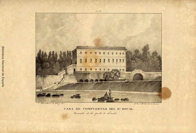 Lámina XIX. Casa de Compuertas del Real Bocal tomada de la parte de Levante. Vista del Palacio nuevo de Compuertas del Bocal, tomado su frente desde el río Ebro, por la parte de Levante, y se designan las bocas por donde entra el agua del río al Canal; a la mano izquierda se manifiesta la presa y una escalinata para bajar a esta; a la derecha, el arco de la Esclusa de comunicación del río con el Canal y delante está colocada la máquina que se usa para limpiar la playa del río, colocada dentro de un pontón o barco para moverla a todos lados, según es necesario.