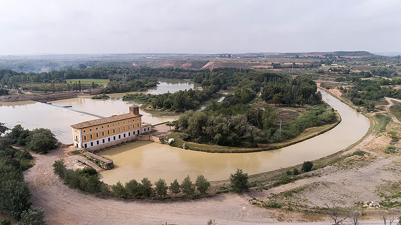 Vista aérea de El Bocal de Fontellas con el río Ebro, el azud y la Casa de Compuertas. Foto Blanca Aldanondo. Diario de Navarra.