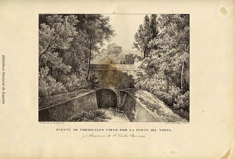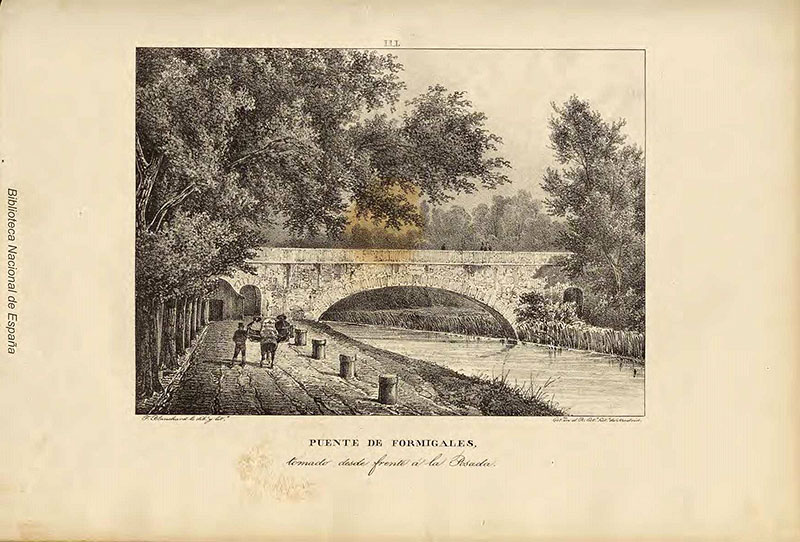 Lámina III. Puente de Formigales, tomado desde frente a la posada. La vista del Puente de Formigales tomada desde la posada de El Bocal. Este puente es el primero que tiene el Canal en todo su curso: está construido de piedra sillería y por él pasa el camino real para Tudela y los demás pueblos de Aragón y Navarra. Se ve todo el curso del Canal y a su izquierda, la Almenara de San Carlos y el arco del puente por el que pasan las caballerías que conducen los barcos.