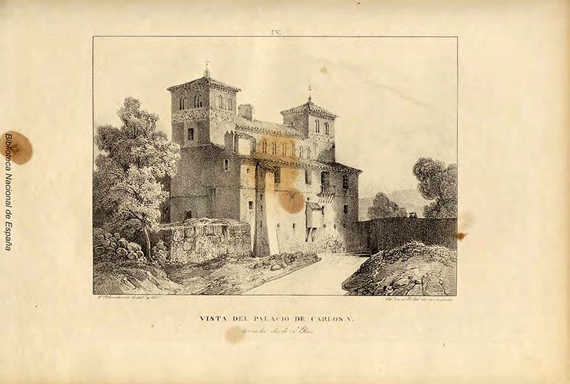 Lámina IV. Vista del Palacio de Carlos V tomada desde el río. Vista del Palacio llamado de Carlos V, tomada desde el río por la parte del Norte. Su fachada representa ser una obra agregada al edificio antiguo, hecho todo de cantería, siendo esta última de ladrillo.