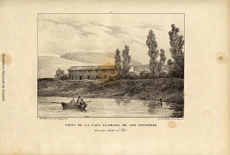Lámina V. Vista de la Casa llamada de los Patrones tomada desde el río. Vista del río Ebro y de su orilla derecha; a espaldas del Canal; y en el intermedio de ambas se representan las casas llamadas de los Patrones, las que se construyeron cuando se hacían las obras de El Bocal y de la Presa, y sirvieron para habitación de los patrones de los barcos, y de otros operarios que trabajaban en dichas obras; y en el día las habitan los pescadores que tienen arrendada la pesca del río.