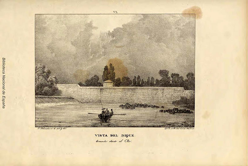 Lámina VI. Vista del dique tomado desde el río. Vista de la gran muralla construida en la orilla izquierda del río Ebro, en la parte superior de la presa, con la que forma un ángulo recto. Se hizo esta obra para contener las aguas del río, las que, con motivo de una furiosa avenida de este, sucedida cuando se estaba haciendo la presa, rompieron por aquel punto, desviándose de su cauce natural; para que volvieran a este la hizo el señor Pignatelli de piedra sillería, a todo coste, asegurándola por su espalda con unos machones y estribos terribles para su mayor firmeza y seguridad.