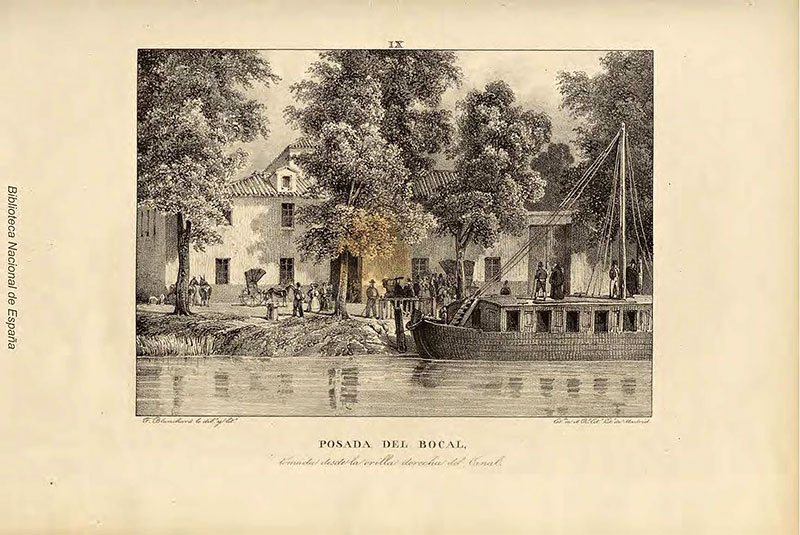 Lámina IX. Posada de El Bocal tomada desde la orilla derecha del Canal. Vista de la posada de El Bocal, y de la llegada del barco ordinario al desembarcadero de este sitio. Se ven los carruajes que esperan a los pasajeros que vienen en el barco para conducirlos a Tudela.