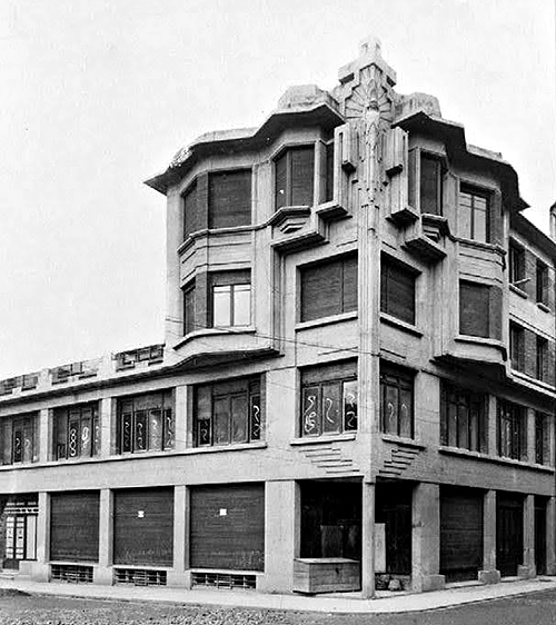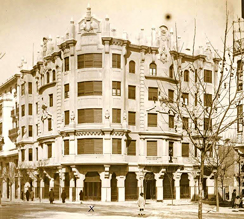 Como relata Fernando Tabuenca, en 1929 la empresa Arrieta y Cía. SL encargó a Víctor Eusa la construcción de un edificio en la manzana que forman las calles García Castañón y Fernández Arenas n.º 4. La empresa de Julio Arrieta dedicaría la planta baja que da a la calle García Castañón a exposición, la que da a la calle Fernández Arenas a despacho y la oficina y el taller estaría instalados en la parte posterior. La primera planta sería ocupada íntegramente por oficinas y la segunda y tercera plantas, más pequeñas que el resto, por sendas viviendas. No sabemos la causa, pero el destino original del edificio cambió. Probablemente podemos relacionarlo con la llegada de la Segunda República. Al terminar la construcción, a finales de 1932, los bajos del edificio fueron alquilados por la Mutua de Accidentes de Pamplona. Solamente una gran escultura de Atenea, la diosa de las artes que preside el edificio en lo alto de la esquina principal, nos recuerda las pretensiones originales del edificio.