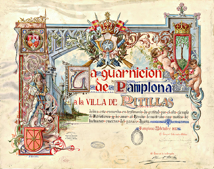 En octubre de 1917, la guarnición militar de Pamplona encarga a Julio Arrieta el diseño de un diploma para agradecer la solidaridad mostrada por el ayuntamiento de Pitillas con el ejército con motivo de los disturbios ocasionados por la huelga general en el mes de agosto. El ejército había sido el encargado de mantener el orden público en la villa. El documento dice: “La guarnición de Pamplona a la villa de Pitillas dedica este recuerdo en testimonio de gratitud por el alto ejemplo de patriotismo y de amor al ejército demostrado con motivo de luctuosos sucesos del pasado agosto. Pamplona 22 octubre 1917”. El documento se conserva actualmente en el Archivo Real y General de Navarra (AGN) (Referencia ES/NA/AGN/13-2/FIG_CARTELES, N.17).