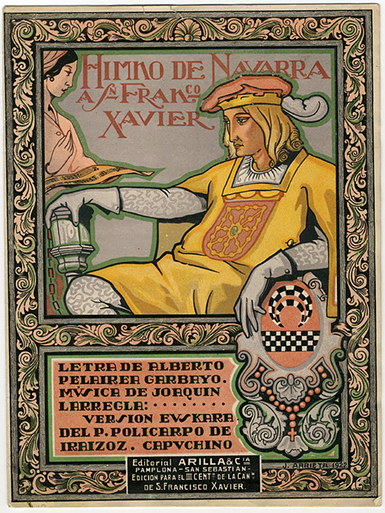 En la portada vemos a uno de los maceros de la Diputación, sedente con la maza ceremonial del Reino y apoyado con su brazo izquierdo sobre el escudo de Javier, del que pende un gran rosario. El macero de pelo largo y rubio y con una gran boina con pluma está vestido de amarillo y luce en el pecho un gran escudo de Navarra. En el margen superior izquierdo, una matrona con la partitura se dispone a interpretar y en la parte inferior se coloca el título, los autores con sus nombres y el del padre capuchino Policarpo de Iraizoz, autor de la versión de la letra en euskera. Un estrecho marco inundado de hojas de acanto rodea toda la composición.