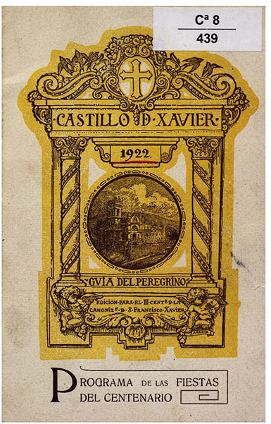 Cuenta con una portada a dos colores, el dibujo propiamente dicho en sepias sobre un fondo amarillo. En él encontramos un gran retablo con el banco con sendos ángeles y una inscripción en la que leemos “EDICION PARA EL III CENTENARIO DE LA CANONIZACIÓN DE S. FRANCISCO XAVIER”, un único cuerpo en cuyo interior luce un medallón circular con un dibujo del castillo y la fecha 1922, sobre él, y un ático con una cruz entre molduras curvas, frutos y la inscripción CASTILLO DE XAVIER. La contraportada luce un escudo timbrado por la corona real con las armas de Navarra y en lo que sería el cuarto cuartel, las de Javier.