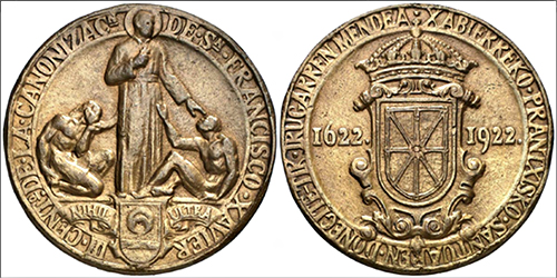 Nuestro paisano Ramón Arcaya ha terminado el modelo, según el modelo de don Julio Arrieta para la medalla oficial del Centenario. Este dibujo tiene en el anverso la imagen de san Francisco con un convertido y un curado milagrosamente, en el reverso las armas de Navarra. La inscripción de la medalla irá en romance en el anverso y en vascuence en el reverso. Tiene esta medalla todo el carácter de las medallas del tiempo de la Canonización.