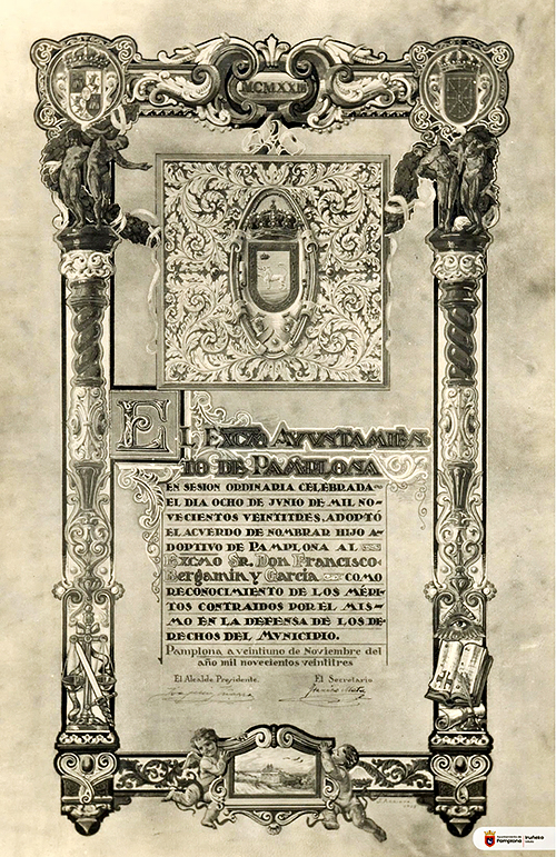 El ayuntamiento de Pamplona, en sesión del 8 de junio de 1923, decide poner su nombre a una de las calles del Ensanche y nombrar hijo adoptivo a don Francisco Bergamín y García. Este político malagueño, que ejerció como ministro en varios gabinetes de Alfonso XIII, desempeño las tareas de abogado de Pamplona en Madrid. Siendo ministro de Instrucción en 1914, reconoció por ley el derecho de Navarra a nombrar maestros. Como abogado del ayuntamiento de Pamplona, defendió al consistorio ganando contra los terratenientes del Ensanche. Como ministro de la Gobernación, en 1920 firmó el proyecto de ley que concedía a Pamplona su expansión urbana para realizar el Ensanche tras el derribo de las murallas que daban al sur de la ciudad. El agradecimiento del ayuntamiento se hizo oficial con el envío de un pergamino diseñado por Arrieta en el que se hizo constar el acuerdo de la ciudad.