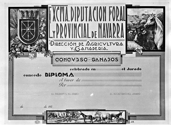 Otra obra que hemos hallado diseñada por Julio Arrieta y relacionada con el trabajo de ilustrador es el diploma otorgado a los premiados en los concursos de ganado comarcal organizados por la Dirección de Agricultura y Ganadería de la Diputación Foral.