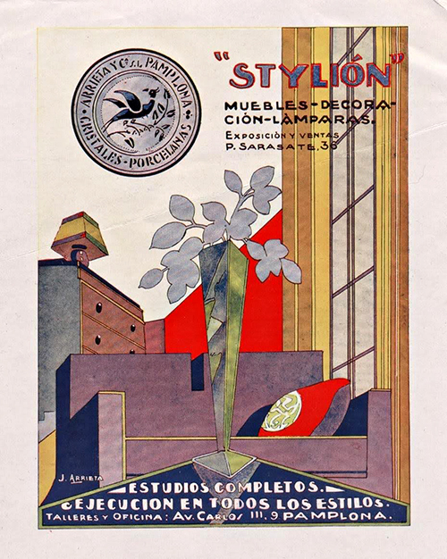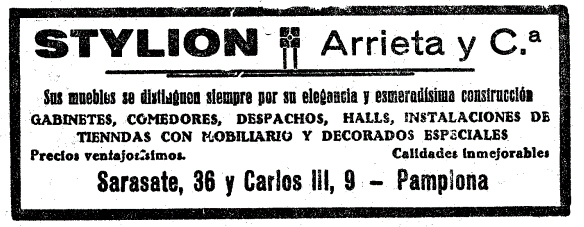 En una conocida plataforma de compraventa y subastas online hemos encontrado un dibujo a todo color anunciando el establecimiento Stylion de Pamplona firmado por Julio Arrieta. Desgraciadamente no hemos podido datar el anuncio ni localizar la publicación, aunque creemos puede ser de principios de los años 30. El anuncio a color y ocupando toda la página de la revista, sigue el estilo art decó característico de la época. Muestra un elegante salón donde se observa, en primer plano, un estilizado y alargado jarrón delante de un sofá de dos plazas Más atrás a la izquierda, una estirada cajonera sostiene una lámpara de tulipa cuadrada. En la derecha, un estiradísimo ventanal con las cortinas descorridas ilumina la estancia. La gran verticalidad de la composición y el uso del color son las características más resaltables del anuncio. En la parte superior izquierda vemos en negro un sello de un ave con la cartela circular: “ARRIETA Y CIA PAMPLONA. CRISTALES PORCELANAS”. En la zona superior derecha se lee en grande y entrecomillado el nombre del establecimiento “STYLIÓN” y debajo “MUEBLES-DECORACIÓN-LÁMPARAS. EXPOSICIÓN Y VENTA P. SARASATE 36”. En la zona inferior del dibujo y junto a la firma del artista encontramos: “ESTUDIOS COMPLETOS. EJECUCIÓN EN TODOS LOS ESTILOS. TALLERES Y OFICINA: AV. CARLOS III 9 PAMPLONA”. El anuncio es un testimonio del talento de Arrieta como dibujante publicitario y de la importancia de la casa Stylión en el panorama comercial de Pamplona como símbolo de modernidad y buen gusto.