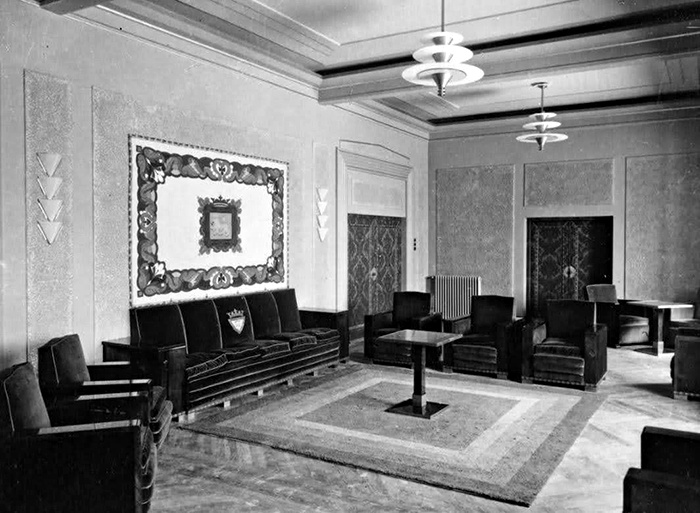 El AGN y la fototeca del Archivo Municipal de Pamplona también conserva fotografías del salón principal que, junto con los dibujos comentados, nos permiten conocer con todo detalle el salón municipal. Se trata de un gran salón con una mesita de tablero cuadrado en el centro que se apoya sobre una alfombra de franjas rectas. Rodean a la mesita seis sofás, de una sola plaza, de sobrias y elegantes líneas rectas, y un gran sofá de cinco plazas con el escudo de la ciudad en el respaldo central. Los sofás según la factura “son de librerías de nogal, almohadones de miraguano, cordones oro viejo, grecas doradas sobre madera, pies de metal cromado y terciopelo rojo”. Encima del sofá de cinco plazas, colgando de la pared, se encuentra un gran repostero con la insignia de la ciudad, rodeado de una guirnalda de volutas. Otras mesitas rodeadas de los mismos sofás completan la estancia. Entre las puertas, en las paredes de color azul, cuatro grandes paneles decorativos enmarcan apliques de luz compuestos por cuatro formas triangulares, de cristal opaco y cromados. Cuatro grandes puertas, tapizadas en damasco rojo, con clavos de metal y remarcadas con grandes molduras, dan acceso a la sala. Del techo, que presenta enormes molduras rectilíneas, cuelgan dos preciosas lámparas con un llamativo diseño formado por tres círculos colgantes sucesivamente más grandes. Todo el conjunto sigue estrictamente los dictámenes del estilo art decó que se encontraba en esos años en sus momentos más álgidos.