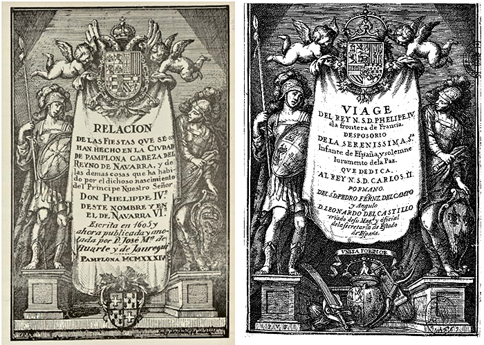 En 1933, la revista Cultura Navarra, órgano del Consejo y Comisión Permanente de Cultura de Navarra, Ateneo Navarro, en su número 6 de diciembre, en las páginas 223 y siguientes, publica un artículo de su director, el historiador y archivero Jose María de Huarte, titulado: “RELACIÓN DE LAS FIESTAS QUE SE HAN HECHO EN LA CIUDAD DE PAMPLONA CABEZA DEL REYNO DE NAVARRA, y de las demás cosas que ha habido por el dichoso nascimiento del Príncipe Nuestro Señor Don Phelipe IV deste nombre y en el de Navarra VI Escrita en 1605 y ahora publicada y anotada por D José M.ª de Huarte y de Jauregui Pamplona MCMXXXIV”. El artículo se inicia con un grabado firmado por Julio Arrieta. El artista utilizó para realizar este dibujo, como nos ha indicado el profesor Ricardo Fernández Gracia, la portada que el grabador Pedro de Villafranca Malagón diseñó para el libro que escribió D. Leonardo del Castillo en 1667 describiendo la firma de la Paz de los Pirineos, en la Isla de los Faisanes (Irún), el 17 de noviembre de 1659, titulado “Viage del Rey Nuestro Señor Don Felipe Quarto el Grande, a la frontera de Francia: funciones reales, del desposorio, y entregas de la Serenissima Señora Infante de España Doña María Teresa de Austria...”.