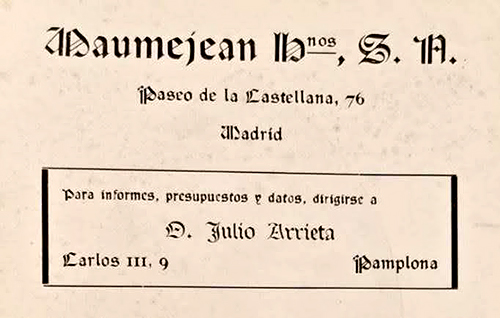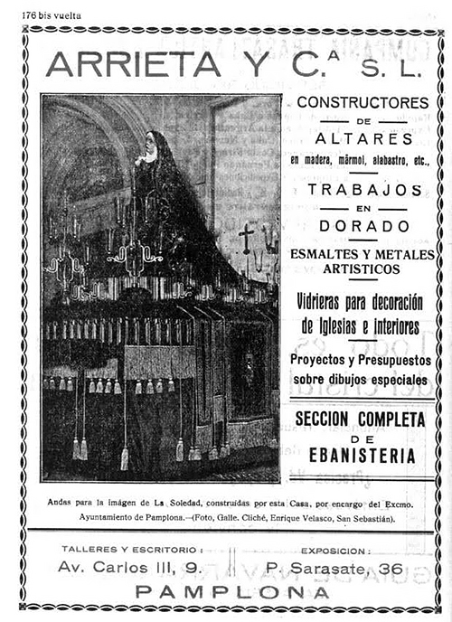 En la Guía de Navarra de 1929-30, la empresa Arrieta y Cía. SL aparece anunciada en distintos apartados. Un gran anuncio del taller aparece en la página 176 bis de la guía indicando que la empresa se dedica a “construcciones de altares en madera, mármol, alabastro, etc. Trabajos en dorado, esmaltes y metales artísticos, vidrieras para decoración de iglesias e interiores. Proyectos y presupuestos sobre dibujos especiales”.