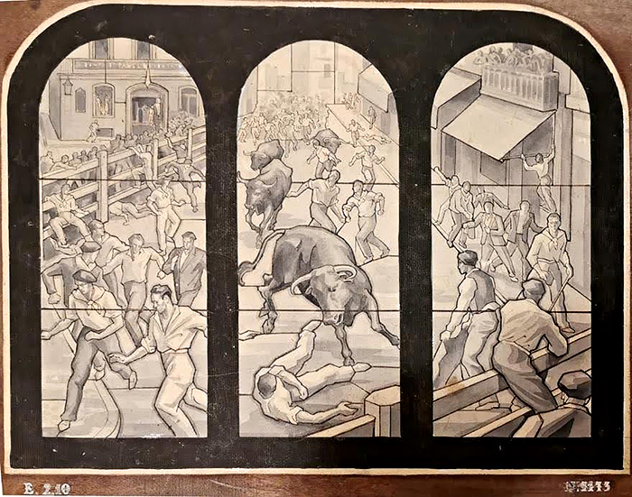 Según testimonio de la familia, además de la representación, Julio Arrieta también diseñó vidrieras para la empresa. La familia conserva gran cantidad de bocetos de vidrieras de la firma Maumejean, entre ellos nos ha llamado poderosamente la atención uno formado por tres paneles en blanco y negro que representa una escena muy conocida del encierro de toros de Pamplona en la calle Mercaderes, que bien pudo ser diseñado por Arrieta.