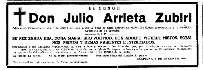 El 25 de marzo de 1951 murió su mujer a los 60 años de edad. Julio Arrieta falleció el 3 de enero de 1966, con 82 años; dejaba una hija y cinco nietos. La prensa lo despedía diciendo: “Ayer descansó en la paz del Señor en nuestra ciudad don Julio Arrieta Zubiri, muy conocido y estimado y cuya muerte ha sido muy sentida por las extensas amistades que supo conquistar con su bondad característica. Fue un industrial prestigioso de firma muy acreditada”.