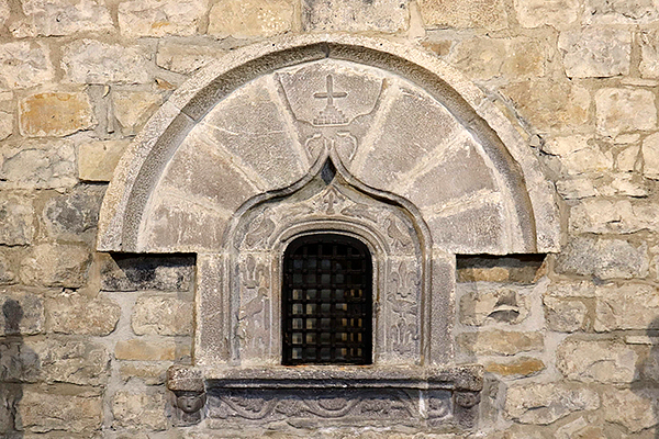 Algo más de presencia tiene el nicho que, procedente del despoblado de Galdurotz, se encuentra reaprovechado en la parroquia de Urroz-Villa (fig. 10), en el muro lateral, al lado de la pila bautismal. El arco carpanel que enmarca la puerta tiene unos toscos relieves de aves, peces y flores de lis, mientras que en la base aparecen un sencillo roleo vegetal. Dos cabezas muy geométricas funcionan de ménsulas para las grandes dovelas que enmarcan toda la pieza. De una hechura muy parecida es el sagrario de Alzuza (fig. 11), ya que también tiene dos ménsulas con cabezas antropomorfas y una estructura similar. En esta ocasión, el perfil del hueco es mixtilíneo, lo que nos permite fecharlo en torno al 1510-1520. Unas aves con unos frutos que parecen uvas podrían ser un motivo iconográfico alusivo a la eucaristía o al paraíso, pero lo cierto es que el nicho se decora someramente con unos rameados, flores y rosas de seis pétalos, y una pequeña cruz sobre la puerta. Este de Alzuza se mantiene en su lugar original en el lado del evangelio y, viendo que en el centro del retablo se encuentra un sagrario de madera dorada y bella policromía de finales del siglo XVI, no cabe duda de que dejó de emplearse como sagrario tras la implantación de los decretos tridentinos.