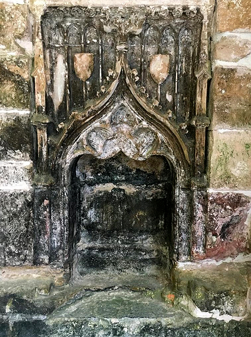 Pero hay también unos nichos artísticamente más sugestivos, con unos diseños arquitectónicos más trabajados. Uno de ellos se encuentra reubicado en una pared del claustro de la Colegiata de Roncesvalles (fig. 13). Aunque esté lleno de suciedad, muy estropeado, descontextualizado y prácticamente inédito, se le aprecia un fino diseño gótico, flanqueado por dos agujas y con un remate con largas ventanas ciegas, muy habitual en el tardogótico europeo, además de dos escudos heráldicos borrados que aportarían una valiosa información para interpretarlo.