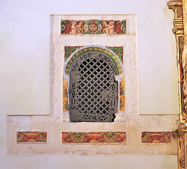 Un nicho interesante es el de Genevilla (fig. 12). Aunque no conserve ni la puerta ni la policromía, que sin duda le dotó de color y visibilidad, es un buen ejemplo para conocer cómo estos sagrarios de tipología medieval fueron sustituidos por otros microedificios de madera cuando se construyeron los grandes retablos renacentistas. El magnífico retablo del siglo XVI no llega a ocultar el nicho, pero tapa parte de su espacio. A pesar de ser un hueco adintelado enmarcado por varios arcos conopiales sucesivos sin decoración, este antiguo sagrario destaca por estar encuadrado por un amplio y voluminoso alfiz con bolas isabelinas, siendo el único ejemplo navarro con estas características, al menos que se conozca hasta ahora.