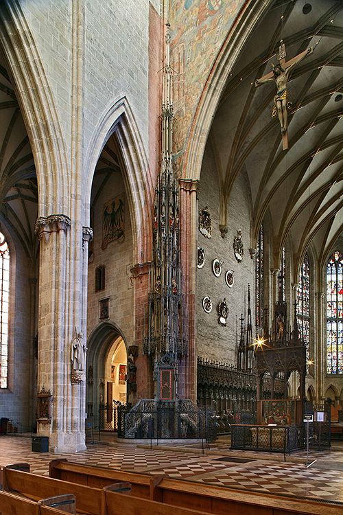 A finales de la Edad Media, en los siglos XV y principios del XVI, los diseños de muchos tabernáculos en Alemania llegan a un nivel de sofisticación extraordinario. Combinan figuras geométricas a diferentes escalas y con múltiples acoplamientos, presentan complejísimos diseños vegetales y geométricos entrelazados, y tienen remates flamígeros que desafían la gravedad y la materialidad de la piedra, creando una “alquimia artística”. Algunos especialistas consideran que la microarquitectura eucarística es un género dentro de la arquitectura que, además, tiene su propia evolución, no siempre pareja a la arquitectura construida. El sagrario de la iglesia de Santa María de Ulm (Alemania) (fig. 2) es uno de los mejores ejemplos de este concepto artístico. Fue ejecutado en 1460-1465 y alcanza la excepcional altura de 26 metros, integrada en su espacio gótico y, al mismo tiempo, destacada gracias a su ambición artística. En la iglesia de San Lorenzo de Núremberg ocurre lo mismo; la microarquitectura eucarística ejecutada por el escultor Adam Kraft entre 1493 y 1496 es una lección de creatividad artística puesta al servicio de la devoción del Santísimo Sacramento.