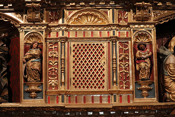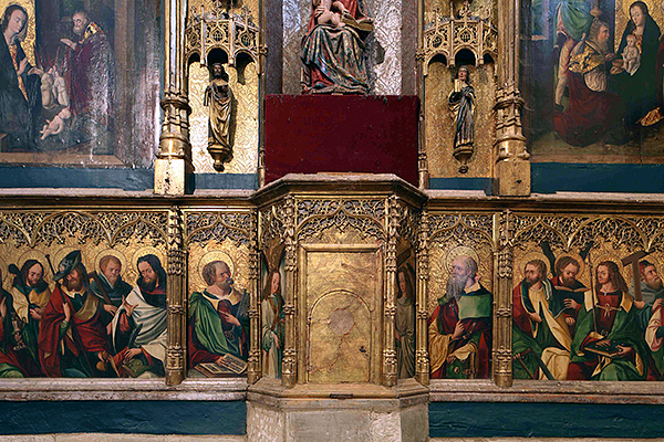 Fig. 24. Banco y primer cuerpo del retablo de la parroquia de la Asunción de Nuestra Señora de Marañón. Principios del siglo XVI. Foto: Justin Kroesen.