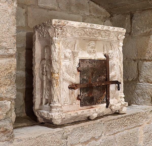 La pieza más espléndida de esta tipología es, sin duda, la píxide de marfil policromado que, procedente de San Pedro de la Rúa de Estella (fig. 7), se conserva en el Metropolitan Museum of Art de Nueva York. Está fechada en el siglo VI y lleva un tema inequívocamente eucarístico que es la multiplicación de los panes, y a Cristo entronizado entre san Pedro y san Pablo, imagen habitual de los sagrarios hasta el siglo XVII.