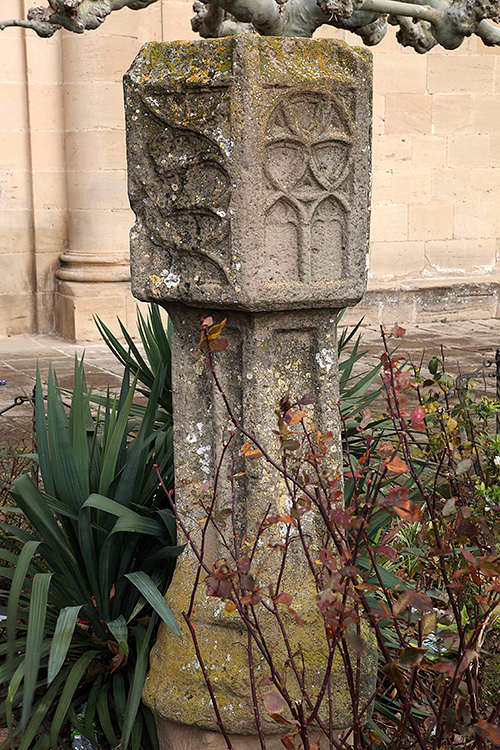 Arróniz (fig. 23) cuenta con la tercera torre eucarística navarra, ahora ubicada en el exterior de la iglesia, a la intemperie, muy deteriorada. Se trata de una torre exenta elevada sobre una columna fasciculada que podríamos fechar en torno al 1500. El cuerpo del sagrario, de planta posiblemente hexagonal, tiene amplias tracerías góticas distintas en cada lado realizadas en mediorrelieve. A pesar de que le falta la mitad del cuerpo central, todo el cuerpo superior y todo vestigio de policromía, y de que esté tan castigado por el tiempo, es un testigo mudo de la existencia de un grupo de torres pétreas en Navarra.