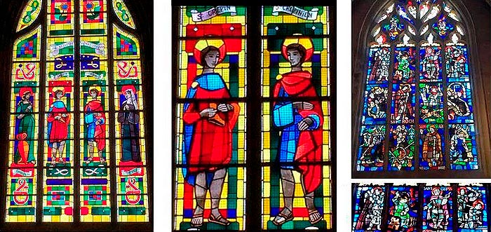 A la izquierda, en la iglesia de San Leonardo de Fougères (Francia), vidriera de François Lorin que incluye a los santos Crispín y Crispiniano (1959). A la derecha, vidriera y detalle con escenas de idéntico motivo en la basílica de San Salvador, en Dinan (Francia). Obra del taller de Louis Barillet, entre 1939 y 1951.
