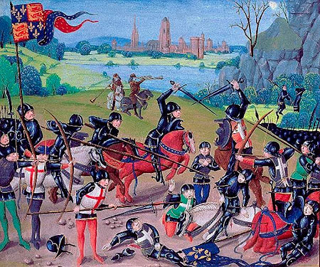 Batalla de Agincourt. Crónica de St. Albans, por Thomas Walsingham. c. 1422. Bibl. Pal. Lambeth (Wikimedia Commons).