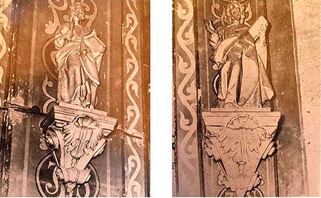 En 1881 se extinguió la Obrería y comenzó a ejercer sus funciones la nueva Junta de Fábrica de San Lorenzo, mediando la entrega y recepción del oportuno inventario. En él consta que la iglesia tenía diez altares, de los que cuatro eran de propiedad particular: uno de estos últimos, el de san Crispín y san Crispiniano, pertenecía la cofradía de los zapateros. Probablemente el desmantelamiento de este retablo, o lo que de él quedara, se produjo con ocasión de las grandes obras emprendidas por el párroco don Marcelo Celayeta entre 1906 y 1908. Quizá fue entonces cuando las imágenes de nuestro presente interés se colocaran en el frontispicio de la Capilla de San Fermín, donde estuvieron hasta mediar los años setenta y donde las hemos conocido; primero en el atrio del templo parroquial, más tarde en la sacristía, y finalmente, con sorprendente transmutación en los santos apóstoles Pedro y Pablo, con retorno a las hornacinas de la entrada.