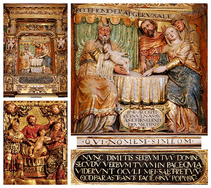 En esta escena se resalta la Presentación de Jesús, y, más específicamente, la manifestación o encuentro con Simeón, quien eleva al Niño en presencia de sus padres y la profetisa Ana, mientras exclama el “Nunc dimitis”, expresión de gozo del mesianismo. La Purificación de María se celebra simultáneamente con la ofrenda de los dos pichones que José deposita sobre el altar en un pequeño cesto, si bien se omiten los característicos cirios o candelas, siendo la única concesión a la luz los dos ángeles alumbradores genuflexos que, cobijados en hornacinas, flanquean esta historia. La caja que alberga el altorrelieve titular y su enmarque configuran una microarquitectura manierista específica dentro de la traza de un retablo de casillero, pues abarca los dos cuerpos de este y sobresale del plano. Consta de banco con una cartela entre san Pedro y san Pablo y un cuerpo-escenario, flanqueado por columnas corintias truncadas sobre telamones. Sobre la Presentación se continúa el relato con los relieves, a modo de viñetas, de los Magos ante Pilatos, Matanza de los Inocentes y Huida a Egipto.