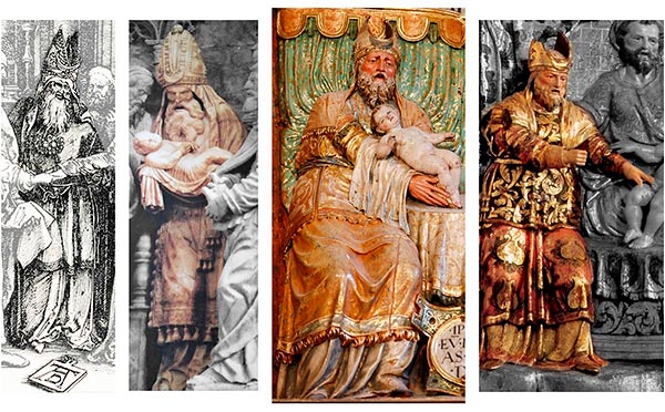 Fotomontaje de Simeón. A. Durero. Sacerdote, de los Desposorios de la Virgen. D. Forment. Presentación del retablo mayor del Pilar, Zaragoza (C. Morte). Elcano. Presentación. Lumbier. Circuncisión del retablo mayor.