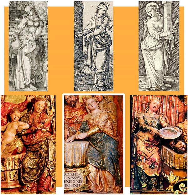 Fotomontaje de la Virgen. Grabados de L. van Leyden, Agar, del Repudio de Abraham. M. Raimondi, Amistad, del Diálogo de A. Berutti y santa Bárbara. Virgen. Lumbier. Elcano. Huarte-Araquil. Salomé, de la Entrega de la cabeza del Bautista del retablo mayor.