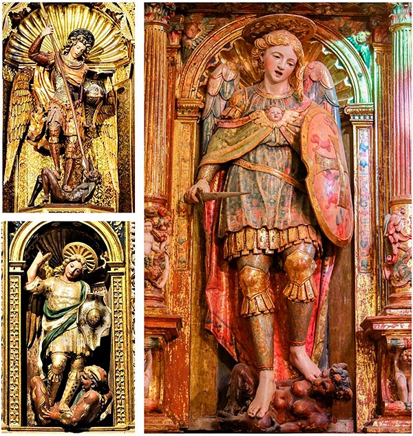Fotomontaje de san Miguel. G. Joly. Titular del retablo de San Miguel de los Navarros, Zaragoza, y san Miguel del retablo de Santiago, colegiata de Bolea (Huesca) (elviajedelalibelula.com). Elcano. Titular de retablo colateral.