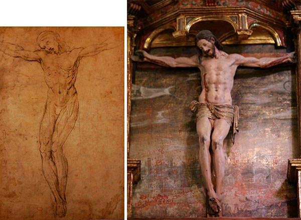 Fotomontaje del Crucificado. Rafael. Estudio para una Crucifixión. Biblioteca Marucelliana de Florencia. Elcano. Crucificado del retablo de San Miguel.