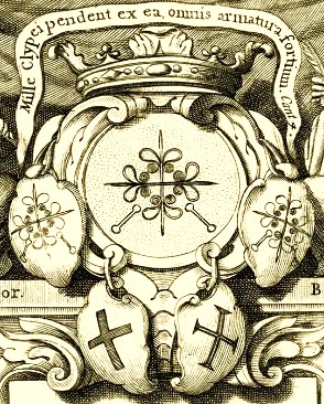 Los dos escudos anteriores, salvando las obvias desigualdades de los adornos externos (corona real y demás) en uno y la leyenda de alrededor en el otro, son cuasi iguales, pero no idénticos. Las diferencias no están en los blasones de Citeaux, Aragón y Navarra, que son los canónicos, ni en la mitra y el báculo que llevan el timbre, y tampoco en la cruz flordelisada de la Orden de Calatrava sobre las que están acolados. Las divergencias se encuentran en las cuatro cruces de las órdenes militares junto al blasón de Citeaux; son variaciones sutiles, pero trascendentes en el simbolismo e interpretación de las figuras. Así, coinciden en que hay una cruz flordelisada sin símbolos específicos (Orden de Alcántara) a la diestra de Citeaux y en que hay una cruz simple de la Orden de Montesa abajo a la siniestra; sin embargo, las otras dos cruces no son iguales en ambos escudos. En el escudo del impreso, la cruz flordelisada siniestra es seguro la cruz de la portuguesa Orden de Avis por tener dos aves (como en el atril), pero en el escudo del sello esa cruz no tiene símbolos específicos; la otra diferencia está en la también portuguesa cruz de la Orden de Cristo, que es triangular en uno y patada en el otro. En nuestra revisión de las cruces de órdenes militares hemos encontrado que esas son formas frecuentes de representar a la Orden de Cristo de manera atípica, pues esa cruz debía ser potenzada.