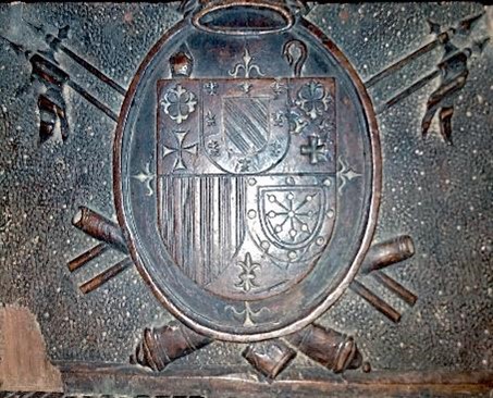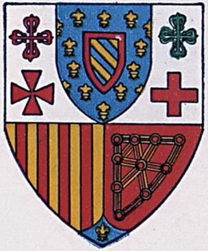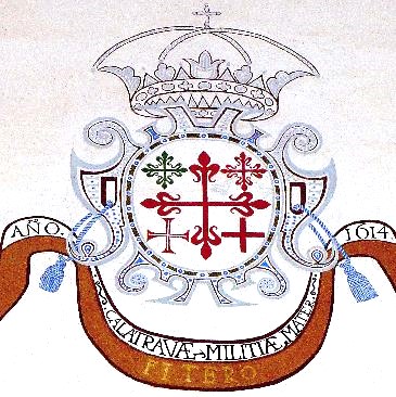 cortado y medio partido: el 1º de plata, sobre el todo el del Cister, acantonado por las cruces militares de Calatrava, Alcántara, Temple (¡ ?) y Montesa, el 2º palado de oro y gules, que es de Aragón, el 3º de gules, a la cadena de oro, que es de Navarra; en punta, lis dorada sobre azur.