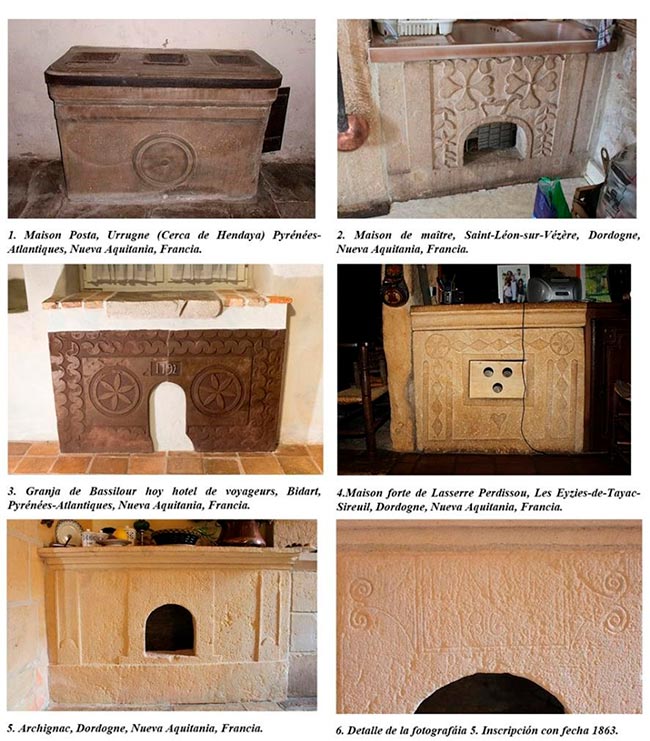 Otra característica que he encontrado en algunos potagers y que se asemeja a lo hallado en Roncal es la presencia de decoraciones en la losa frontal. En las fotografías de la figura 10 se muestran los cinco casos de potagers pétreos con el frente decorado que he podido localizar. Para acrecentar más la analogía con las cocinas roncalesas, dos de ellos presentan inscripciones con probablemente la fecha de su construcción (véanse en la figura 10 la fotografía 3 con fecha de 1792, y la fotografías 5 y la 6 en más detalle, la fecha de 1863). Llama poderosamente la atención que estos cinco potagers franceses de piedra y con decoraciones frontales sean todos de la región de Nueva Aquitania, la más cercana al valle de Roncal. ¿Podríamos aventurar la hipótesis de que las cocinas pétreas roncalesas pudieran estar influenciadas por estas cocinas francesas del otro lado del Pirineo?