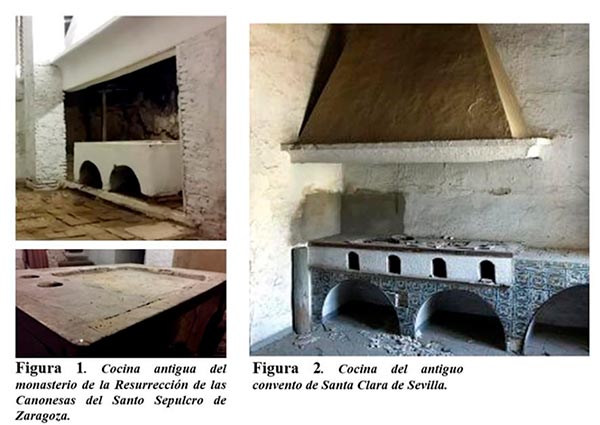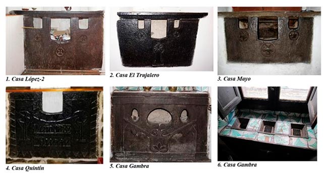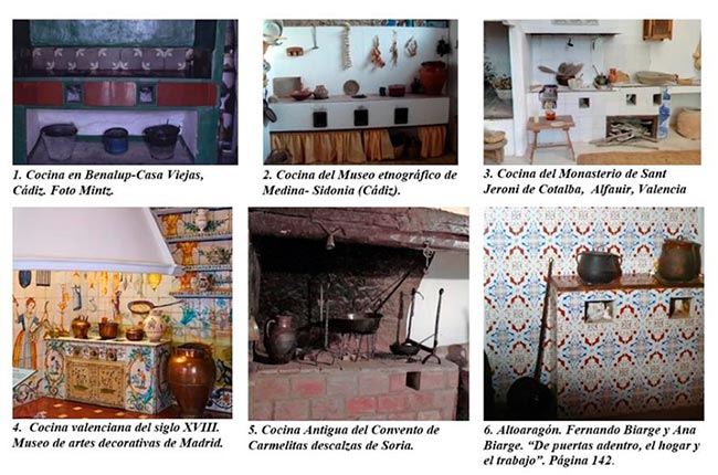 En este mismo blog se publican varias fotografías del antropólogo estadounidense Jerome Richard Mintz, realizadas probablemente en Benalup-Casa Viejas, Cádiz, que ilustran muy bien cómo eran estos artefactos (véase la fotografía 1 de la figura 3). Otras fotografías entresacadas de las páginas web del monasterio de Sant Jeroni de Cotalba en Alfauir, Valencia; de los museos de Medina-Sidonia en Cádiz y el de Artes Decorativas de Madrid; del convento de las carmelitas descalzas de Soria o de la publicación de Fernando Biarge y Ana Biarge, De puertas adentro, nos muestran ejemplos de estas cocinas en lugares tan distantes como Cádiz, Valencia, Soria o el Altoaragón (véanse las fotografías 2, 3, 4, 5 y 6 de la figura 3).