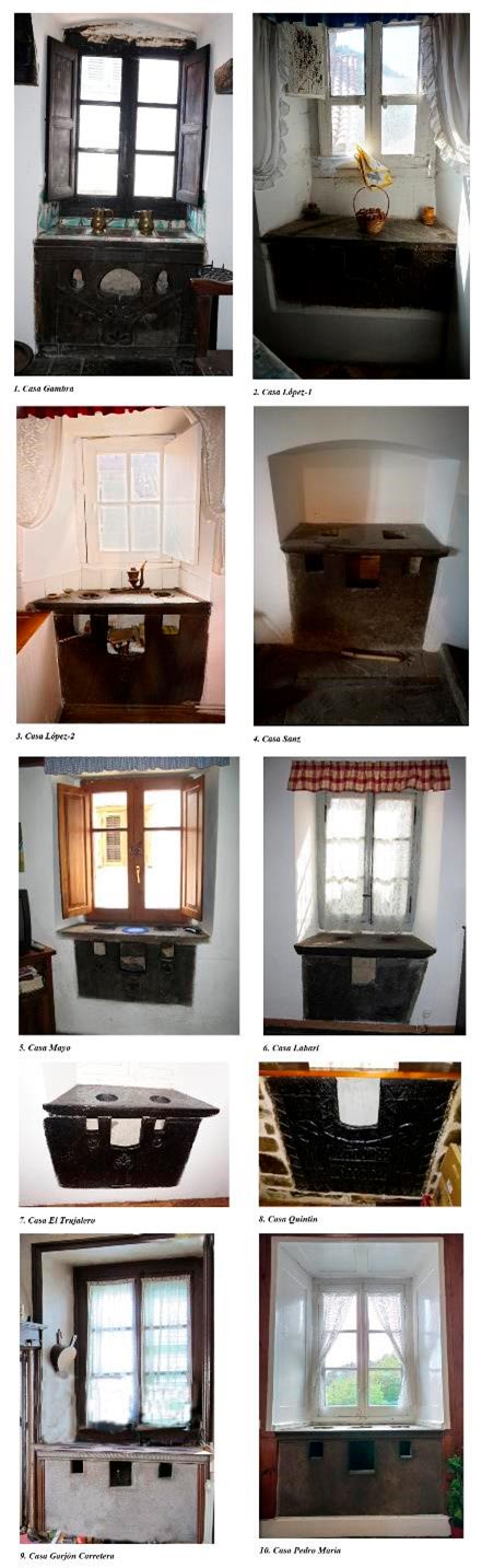 Todas las cocinas estudiadas, excepto la de Casa Sanz, se encuentran colocadas debajo de una ventana. La única que no presenta esta situación se localiza debajo de la gran campana de la chimenea que cubre el fogón bajo también llamado fogaril o ‘sukalte’ (en eusquera roncales). La cocina pétrea de Casa Gambra, aunque se encuentra debajo de una ventana, también se localiza debajo de la enorme campana de salida de humos que presenta el fogón bajo de esta casa (véanse las fotografías de la figura 5).