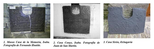 No he realizado un estudio de distribución geográfica de estas cocinas pétreas, pero con toda seguridad se usaron en otras localidades del valle de Roncal. Una magnifica placa frontal con inscripción puede verse en la Casa de la Memoria de Isaba (fotografía 1 de la figura 6). Otro ejemplar, también con inscripción, lo conocemos por una fotografía de Juan de San Martín realizada en 1965 en Casa Conye de Isaba y que se conserva en la actualidad en la fototeca del archivo de Diputación de Guipúzcoa (fotografía 2 de la figura 6). Desconozco el paradero actual de esta cocina. También he encontrado otro precioso ejemplar de losa frontal descontextualizada en Casa Sirón, en Ochagavía (fotografía 3 de la figura 6), en el colindante valle de Salazar. La losa es expuesta todos los años por sus orgullosos propietarios en la fiesta de Orhipean que organiza la villa a finales de agosto para mostrar las costumbres salacencas de hace un siglo. Sus medidas son 58 cm de alto y 58 cm de ancho.