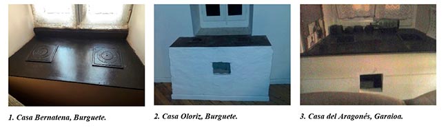 En el intento de estudiar esta tipología pétrea de las cocinas en otras localidades, he podido localizar algunas cocinas elevadas en otros valles cercanos gracias a colaboradores. He encontrado tres cocinas elevadas en dos localidades navarras, una en Garaioa y otras dos en Burguete. Estas cocinas parecen presentar un modelo diferente al encontrado en Roncal. Ninguna de las tres utiliza planchas de piedra, sino que están conformadas por una plancha de hierro, con sus hornillos en la parte superior, apoyada en lo que parece una construcción de mampostería (véanse las fotografías de la figura 8). Estas cocinas se asemejan más a las cocinas que describe Miren Ynchausti en su artículo de etnografía de Aria (valle de Aezcoa):