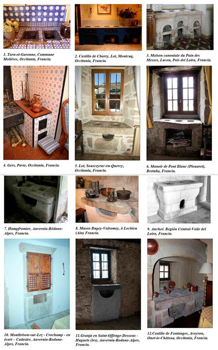 Las cocinas elevadas anteriores a las económicas reciben en Francia el nombre de ‘potager’ y aparecen descritas en 1680 en el diccionario de César-Pierre Richelet como “una especie de estufa grande con varios fogones que se utiliza para cocinar a fuego lento sopas y guisos”. En varias páginas web etnográficas francesas he podido localizar fotografías de estas cocinas y explicaciones sobre su estructura y funcionamiento. Así, en la página web de “Patrimoine et Histoire de Champfromier”, en la región francesa de Auvernia-Ródano-Alpes, se pueden ver dos cocinas pétreas (fotografías 7 y 8 de la figura 9) y explican que