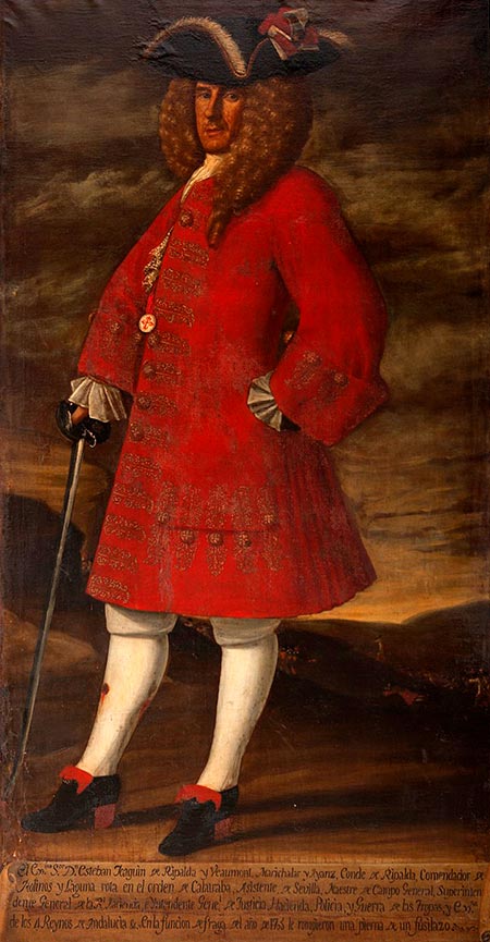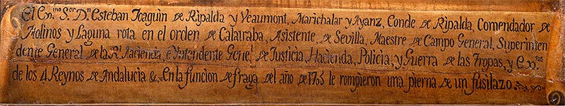 El cuadro se completa con una inscripción que aparece ocupando toda la parte inferior sobre lo que pretende ser un pergamino enrollado: El Exmo. Sor. Dn. Esteban Joaquín de Ripalda y Veaumont Marichalar y Ayanz, Conde de Ripalda, Comendador de/ Molinos y Laguna rota en el orden de Calatraba, Asistente de Sevilla, Maestre de Campo General, Superinten/dente General de la Real Hacienda, e Yntendente Genel de Justicia, Hacienda, Policía y Guerra de las Tropas y Extos/ de los 4 Reynos de Andalucía. En la función de Fraga del año de 1703 le rompieron una pierna de un fusilazo.