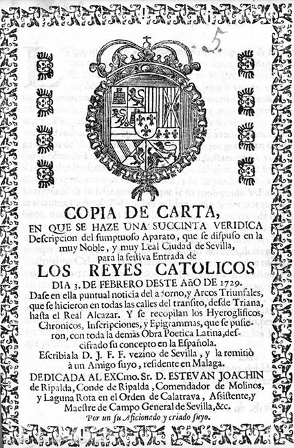 Copia de carta, en que se haze una succinta verídica descripción del sumptuoso aparato que se dispuso en la muy Noble y muy Leal Ciudad de Sevilla para la festiva Entrada de los Reyes Católicos. Día 3 de Febrero deste año de 1729.