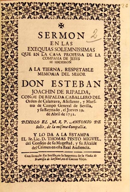 ANTONIO DE SOLÍS, Sermón en las exequias solemnissimas que en la Casa Professa de la Compañía de Iesus se hicieron a la tierna, respetable memoria de don Esteban Joachin de Ripalda, Conde de Ripalda, Imprenta de la Viuda de Francisco Leefdael, 1731.