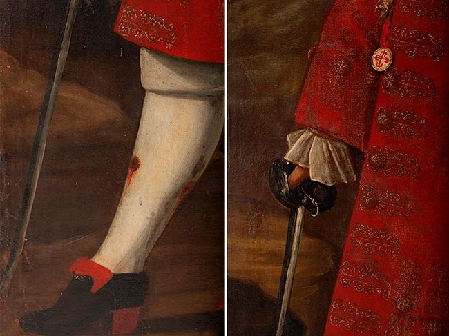 El retrato, de calidad discreta, responde a modelos cortesanos europeos y no hace sino repetir la pose que consagró en 1701 Hyacinthe Rigaud en su retrato de Luis XIV (Museo del Louvre). De este modo, el protagonista aparece girado de tres cuartos, con una pierna más avanzada que otra, mirando al espectador, con el brazo izquierdo doblado sobre la cintura y el derecho apoyado en un objeto, en este caso la espada, propia del oficio militar. Lógicamente aquí se han suprimido los emblemas, símbolos e indumentaria del poder real que acompañaban al Rey Sol.