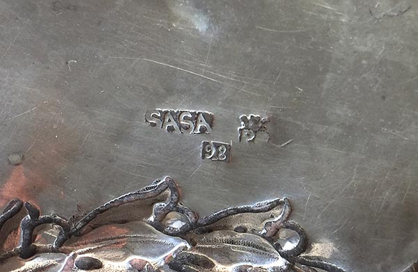 Las cuatro bandejas presentan la triple marca preceptiva en Pamplona en estos momentos: localidad, autor y fecha. La primera, una doble P coronada, corresponde a la capital navarra, siendo la tercera de las variantes utilizadas a lo largo del setecientos; la segunda, 98, alude al año de ejecución de las piezas, 1798; y la tercera, SASA, es el punzón de autoría, perteneciente al platero pamplonés Pedro Antonio de Sasa (1745-1831). Este artífice fue miembro de una dinastía de maestros que dominó el panorama de la platería en Pamplona a lo largo del siglo XIX. Hijo del platero Gregorio de Sasa, natural de Barasoain pero residente en Logroño, se formó en Pamplona con José de Yabar, primero durante seis años como aprendiz, y posteriormente otros cuatro años como oficial. Obtuvo el título de platero en 1775, para lo cual presentó el dibujo de un azafate, siendo las otras dos piezas que se le dieron a elegir un jarro a la francesa y una palangana. En 1772 se casó con Victoria Planillo, sobrina de la mujer de su maestro, Joaquina Redín, a quien habían proahijado, dado que ellos no tuvieron hijos. El nuevo matrimonio se estableció junto a Yabar, encargándose de su tienda y clientela, una de las más prestigiosas del momento en la ciudad, heredándolo todo a su muerte en 1777, lo cual le colocó en una posición inmejorable para afrontar el ochocientos. En 1796, el ayuntamiento de Pamplona lo eligió, junto a Francisco Iturralde y con un salario de veinticinco ducados, para acompañar al platero Manuel de Montalbo en su cargo de marcador, para lo cual se le dio en custodia una de las tres llaves del arca donde se guardaba el sello de la ciudad y los instrumentos para marcar la plata. Hijo de Pedro Antonio fue Vicente Sasa, también platero, que creemos se habría formado junto a su padre y que obtuvo el título de maestro en 1807, eligiendo como pieza de examen un azafate con decoración de motivos vegetales.