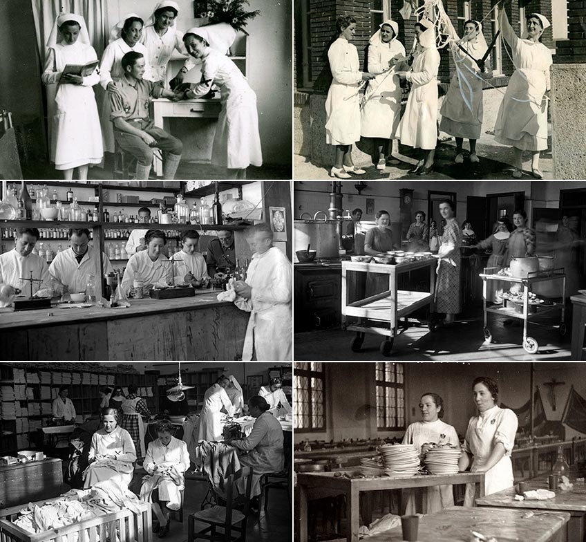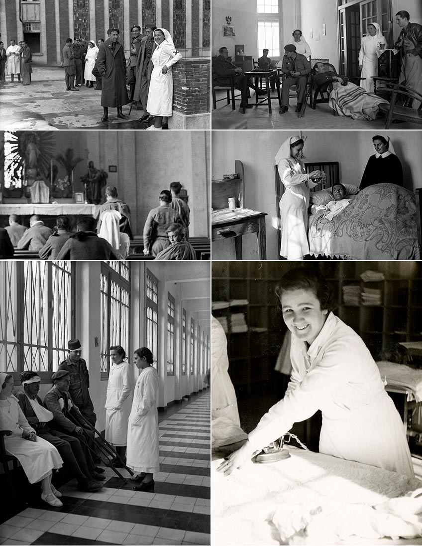 Otras fotografías, más secuenciales, recogen el funcionamiento de los servicios de ropería –desinfección, lavado, reparación, planchado y almacenamiento de la ropa– y del comedor: desde la preparación y reparto de la comida en sus largas mesas corridas y la bendición por el capellán, hasta las jóvenes voluntarias recogiendo la vajilla tras la comida.